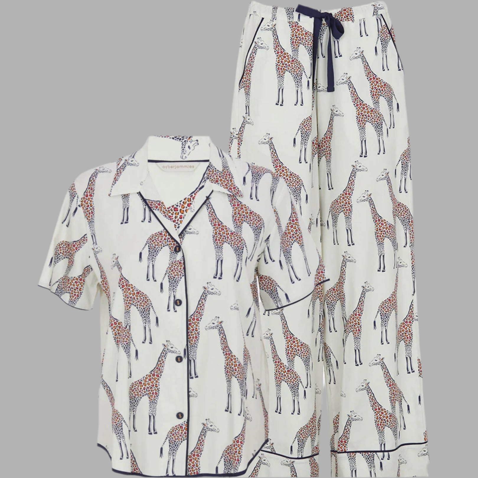 Lounge like the queen of the jungle, even if you’re just queen of the sofa, in the stylish comfort of our Georgina Womens Cream Mix Giraffe Print Short Sleeve Wide Leg Pyjama Set. Rocking a playful print of marching giraffes against a cream fabric backdrop, both the top and bottoms are crafted from a luxurious blend of 60% cotton and 40% modal for a super-soft feel as you unwind. The pyjama top boasts a one-piece pointed collar, short sleeves, and a shaped bottom hem for a refined silhouette. Meanwhile, the bottoms feature wide legs, a flat front, and straight cuffed hems to complete the look. This set is trimmed with a navy modal, features a matching set of buttons and modal drawstring, and combines style with practicality with two side pockets, making this set perfect for relaxing in style. Both the top and bottoms are available for individual purchase, letting you mix and match styles as you please