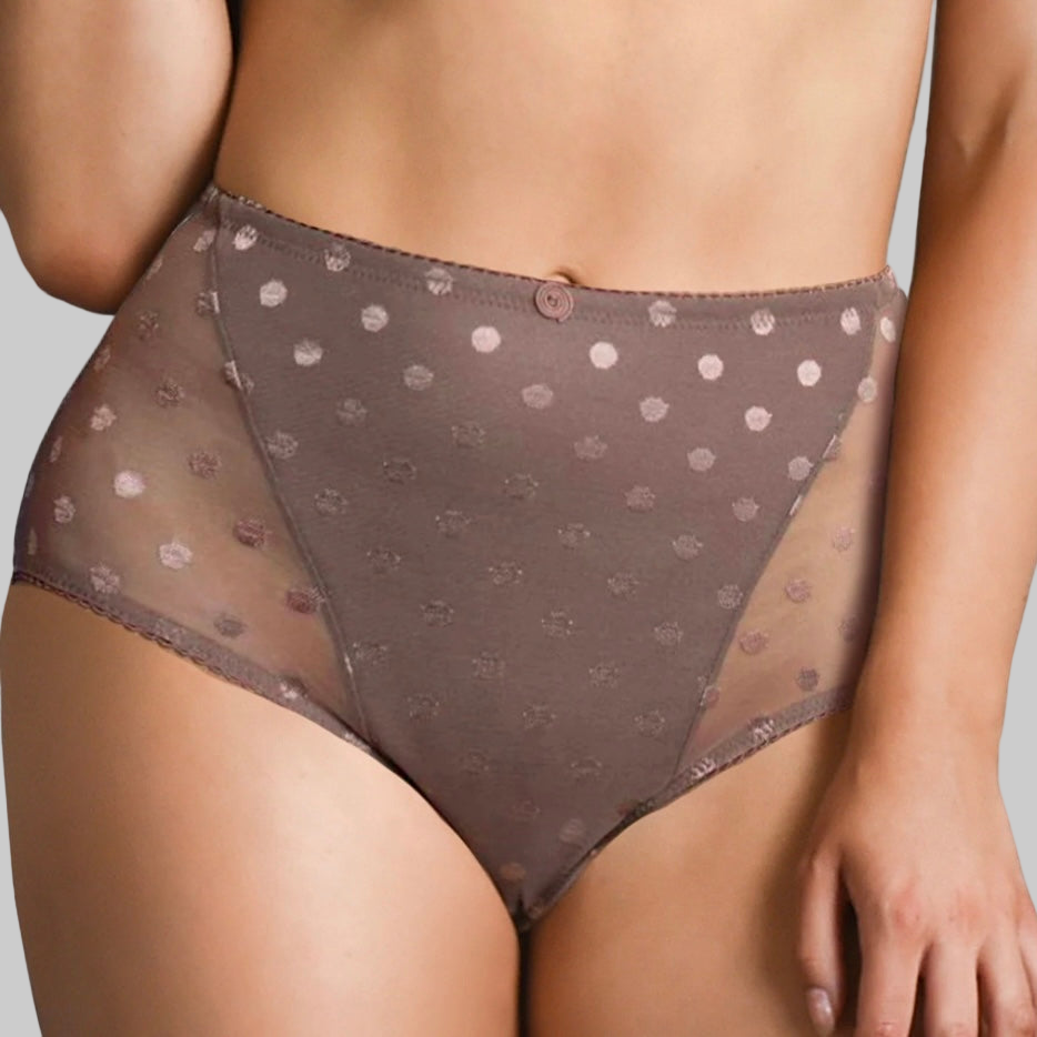 Full briefs are high-rise stylish panties with elastic fabric at the back that provides snug fit and maximum comfort. Front panel is combination of polka dot knitted mesh and polka dot fabric. This style will hug the curves in all right places to provide great fit and coverage