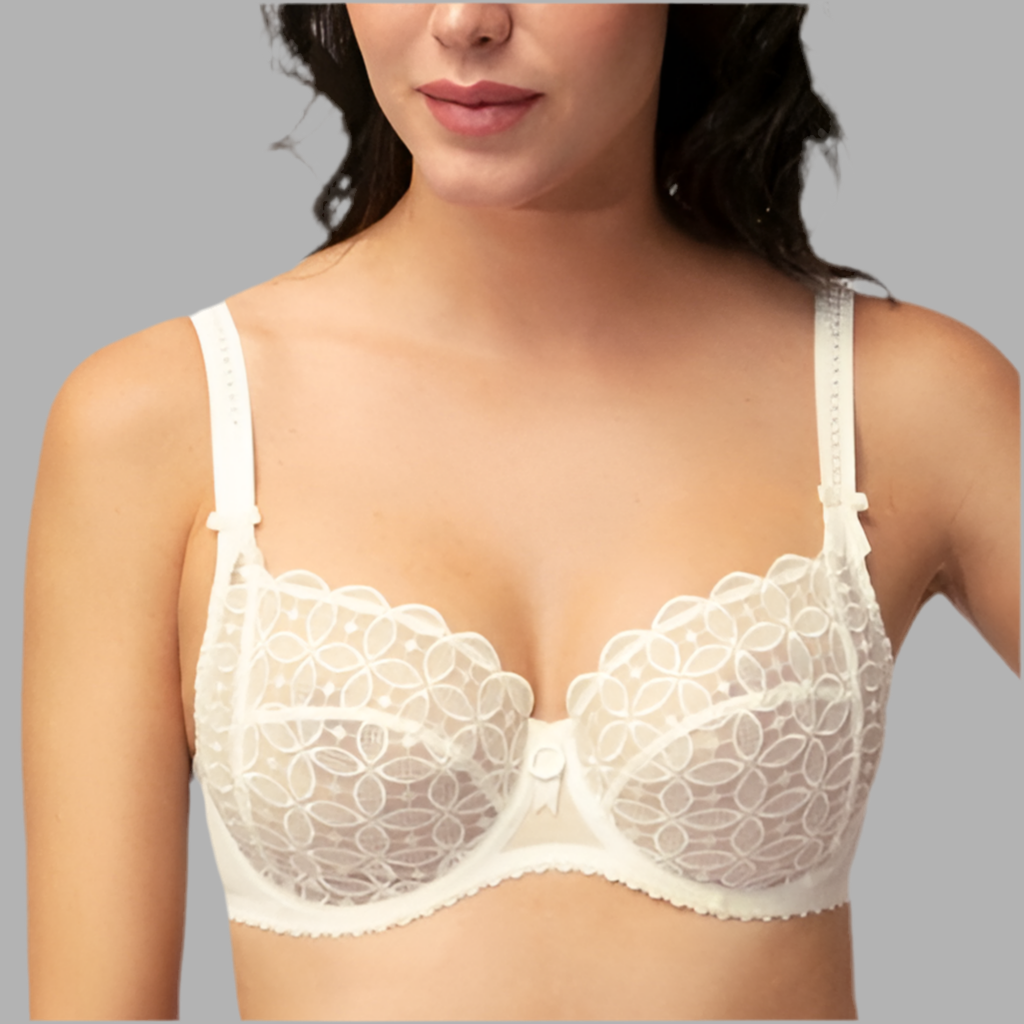 With its well-centred straps, dense embroidery and reassuring lining, this underwired, full cup bra encapsulates all the advantages of a bra which provides excellent support. Available up to an H-cup. Performance and elegance combine here to create a new, must-have lingerie item in the timeless Natural colourway.